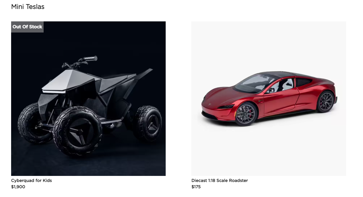 현재 테슬라는 자동차 이외에도 자동차 액세서리, 미니어처 자동차, 어린이용 4륜 ATV 등을 판매하는 것으로 알려져 있다.