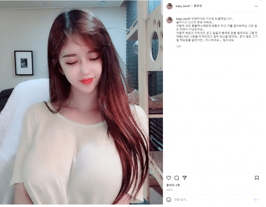 과거 리얼돌녀로 유명세를 탔던 bj열매 (본명: 이수빈)이 자신의 인스타그램에 올린 글이 화제다.